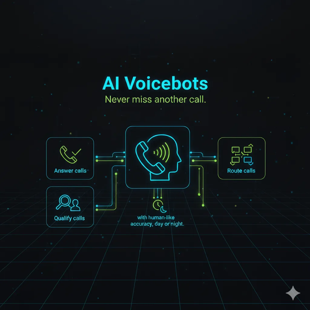 A: Voice AI acts like a 24/7 virtual receptionist, answering and qualifying every call — even after business hours. For local companies like HVAC contractors, realtors, and dental offices, this ensures every lead is captured and routed correctly. Many Chicago-area businesses report faster response times and higher appointment bookings after implementing our AI Voicebot system.